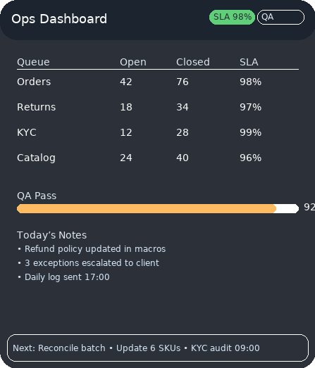 We’ll stand up trained agents for data entry, order updates and ticket triage—with clear SLAs, QA scorecards and daily progress logs.